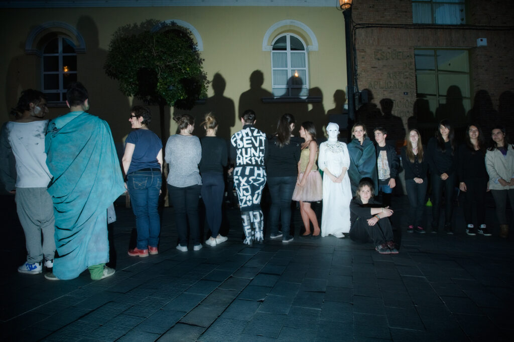 Uno por uno fueron saliendo y ocupando sus lugares, hasta que la lectura de un texto puso fin a la obra escultórica efímera. En el montaje participaron Ignacio Alonso, Elena Andrés, Isabel Campos, Cristina Doñate, Gema Guillén, Jesús Herrer, Cintia Masegosa, Alba Mozas, Tania Pons, Lorena Sanz, Pablo Blesa, María Blesa, Natalia Diéguez, Raquel García, Marta Pascual e Irene Torán.